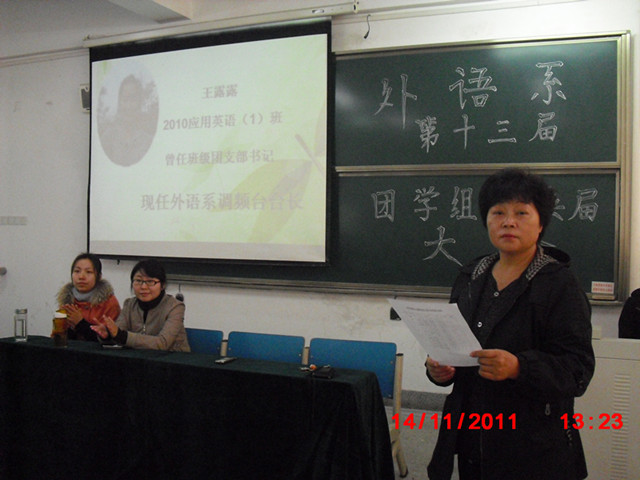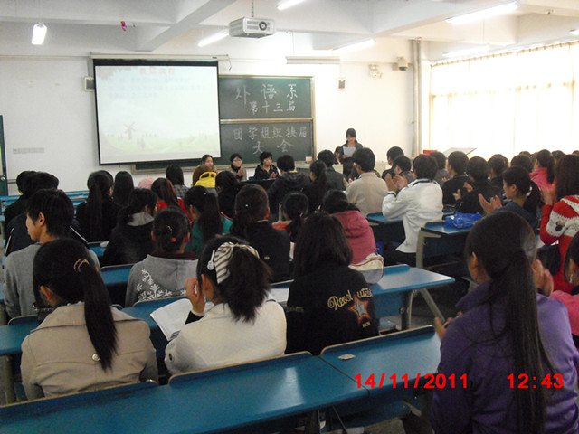 首先,第十二届团总支副书记、学生会主席及团学组织各部门部长对过去一年的各项主题活动及在活动中取得的经验教训进行了总结汇报,对系领导和老师所给予的指导与信任表达了感激之情,回顾了一个个难忘而精彩的瞬间,并且对新一届团总支·学生会寄予祝愿与希望。接下来,系书记对新一届学生干部的当选和加盟表示诚挚地欢迎和热烈地祝贺,郑重地宣读了第十三届团总支、学生会学生干部名单。新学干一一表态,纷纷承诺一定会珍惜锻炼机会,主动承担责任,积极为师生服务,以学长、学姐为榜样,在以后的工作中不断创新,努力打造富有外语系特色的主题活动,丰富校园文化氛围。随后,系党总支书记为第十二届团总支副书记、学生会主席及各部门部长颁发了聘书和纪念品。其后,与会老师对新老学干寄予厚望,系书记对换届大会进行了总结,希望老一届的学生干部能够继续发扬外语系团总支·学生会严谨、认真的工作态度和精神,在以后的工作中取得更大的进步,成为社会的中坚力量,为母校增光添彩;期望新一届学生干部能够以老学干为榜样,本着全心全意为师生服务的理念,工作中要勇于创新,积极探索,服从领导,精诚团结,密切合作,努力使外语系团总支·学生会成为一个工作理念新、服务意识好、进取精神强、执行度高的优秀团学组织。