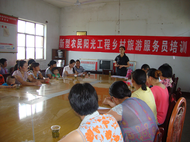 继乡村旅游服务员集中培训之后,为了使培训达到学以致用的目的,7月18日至23日,外语系针对山王村和林场村在农业产业发展方面的不同优势,分别对两村开展了为期六天的现场指导。此次现场指导内容涵盖了农家乐开办的申报程序、经营方法与管理模式,特色景点的导游讲解,农家乐餐厅服务礼仪现场演示等。