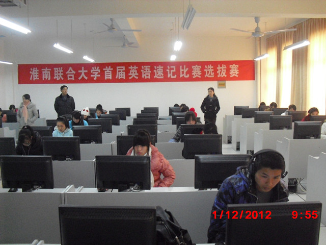 由外语系主办的淮南联合大学首届英语速录速记比赛选拔赛于12月初举行。本次选拔赛旨在深化高职高专教育英语课程教学改革,展现和提高高职高专学生英语速录速记能力,激发广大高职高专学生学习英语的积极性,同时选拔优秀选手参加即将于2013年1月中旬在北京举办的“高教社杯”全国高职高专院校首届英语速录速记比赛。