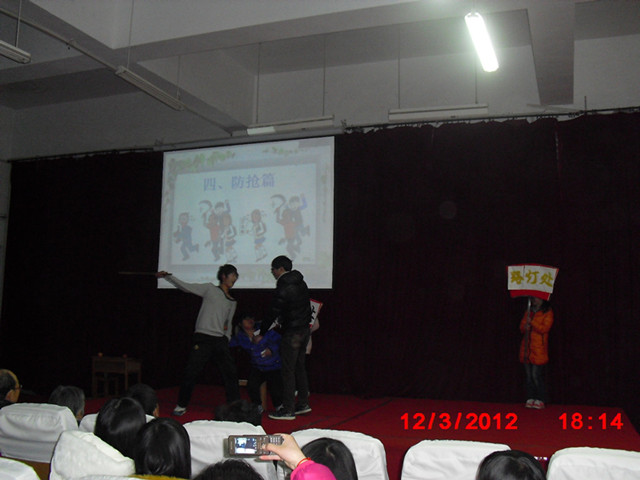 为了将校园安全意识牢牢地根植于同学们的脑海里,将安全责任扎扎实实地落实在行动上,外语系于3月12日下午5:30在220报告厅,举办了一场涵盖防火、交通安全、防盗、防抢、防骗、防传销、饮食及食品卫生安全等内容的校园安全知识讲座。校后勤保障处平处长,校关心下一代工作委员会老同志应邀听取了讲座。