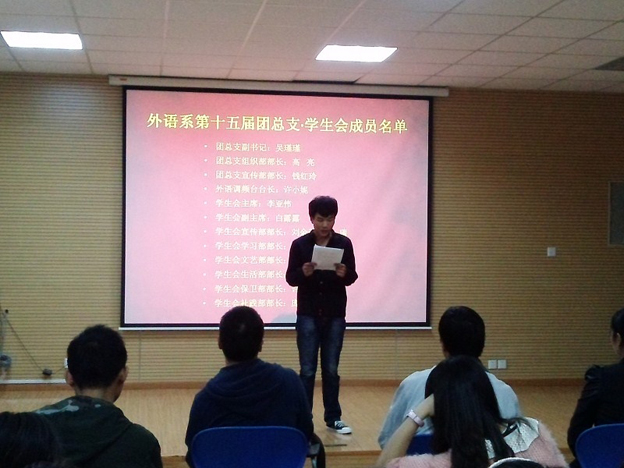 会上,第十四届的团学组织各部门负责人对过去一年各项主题活动及在活动中取得的经验教训进行了全面细致地总结与汇报,对系领导和老师所给予的指导与信任表达了感激之情。随后,选举产生了新一届团学组织。新当选的学干进行了富有激情的就职演讲,表达了努力做好学生工作,为外语系争光的坚定决心。