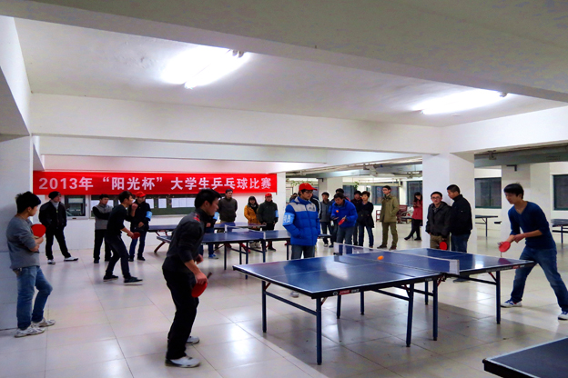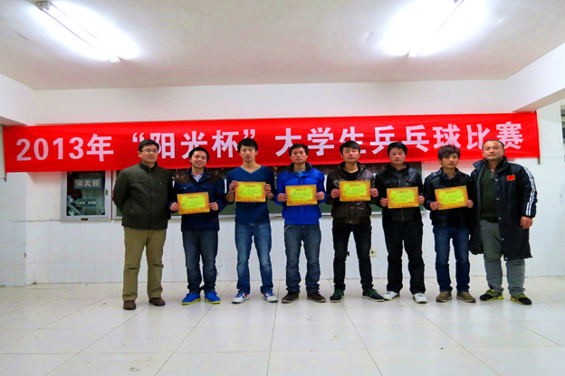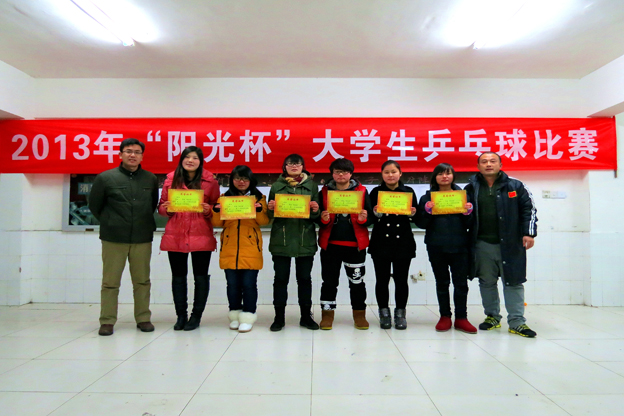 12月25日下午,2013年“阳光杯”大学生乒乓球比赛在我校体育活动中心圆满落幕。本次比赛共有300多名大学生参加,经过几轮激烈的比赛,最终苏建龙、王成顺、魏文祥等六位同学荣获男子单打前六名,余静、张慧慧、吴丹丹等六位同学获得女子单打前六名。