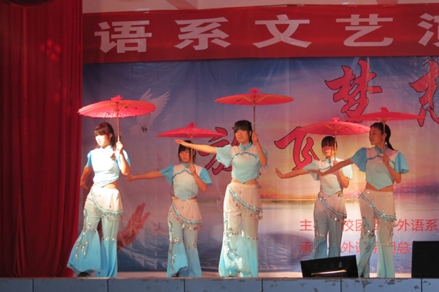 演出现场布置新颖、装点一新。演出在系党总支书记的激情致辞中拉开帷幕。大气澎湃的开场舞《吉祥谣》率先带动了全场热烈的气氛,优雅婉约的日本舞蹈带领观众体验了异国风情,激情四射的现代舞《耍酷》让观众领略了2013级新生风采,灵动曼妙的雨伞舞和《采茶舞》带领大家走进了江南水乡,气韵非凡的一曲《新不了情》唱出了外语学子的心声,表达了外语学子对学校的美好祝愿和深深眷恋,搞笑雷人的双簧表演《英雄就义》更是惹人笑得前仰后合,将晚会推向了顶点。动感柔美的舞姿,劲爆动听的歌曲,幽默传神的曲艺节目,使全场气氛不断升温,现场掌声雷动,尖叫声不断,让观众们沉浸其中。晚会尾声的手语表演《相亲相爱一家人》传递了外语人永远相亲相爱的心语。毕业生致献的诗朗诵表演《青春之歌·我们毕业了》更是表达了毕业生对校园的无比依恋,同窗间的离别之情,师生间的难舍难分伴随着音乐节奏的跌宕起伏不断席卷现场,不舍、眷恋、伤感拂过每一个人的心房,文艺演出圆满落幕。