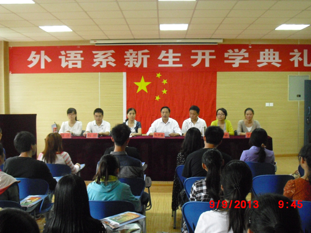 典礼首先由系主任马莹致辞,她代表外语系全体师生热烈欢迎2013级新生的到来,接着,她向新生详细地介绍了淮南联合大学的校情校貌及外语系的系情系貌,使新生对学校和系部雄厚的师资力量、严谨的校风学风和丰富的教学资源有了十分清晰的认识和了解。她还对新生寄予厚望,并祝愿所有新生学有所成。随后,教师代表邵卫平以师长和朋友的身份为学生在校生活和学习提出了的中肯的建议和明确的要求。老生代表李文伟同学在发言中建议新生要放平心态,充分利用学校和系部的教育资源,广泛学习,开阔视野、培养兴趣,努力实现自我价值。2013级新生任凡凡同学代表新生表态发言,“大学不是人生奋斗的终点,我们将从这里起航,珍惜青春,合理安排时间,科学规划,把自己培养成为对国家和人民有用的人才”。最后,系党总支书记对即将翻开大学生活新篇章的同学们表达了殷切的期望,他希望新同学志存高远、努力求索、大胆创新、团结协作,尽快投入到新的学习生活中,真正开始体验做人、做事、做学问的真谛。期待在外语系这个广阔舞台上一睹新生们最亮丽的风采。典礼尾声,与会师生合影留念,开学典礼在一派祥和愉悦的氛围中圆满落幕。