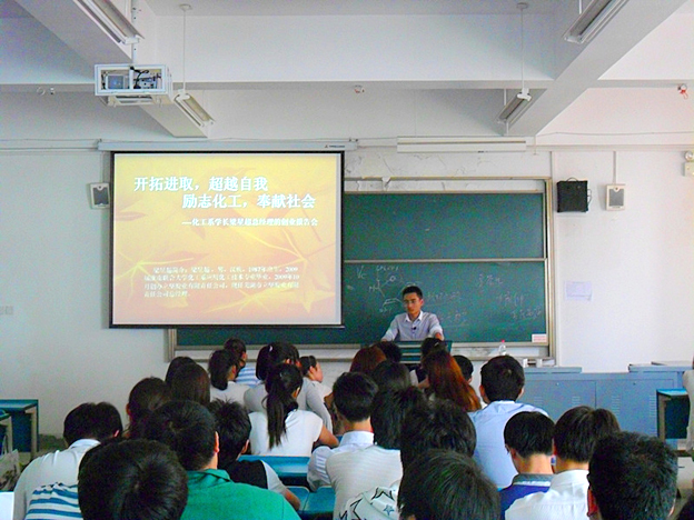 5月20日下午,化工系09届毕业生梁星超应邀在东区317多媒体教室做了一场生动的创业经验交流会,化工系全体学生参加会议。