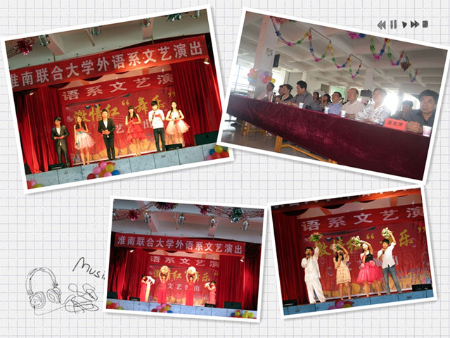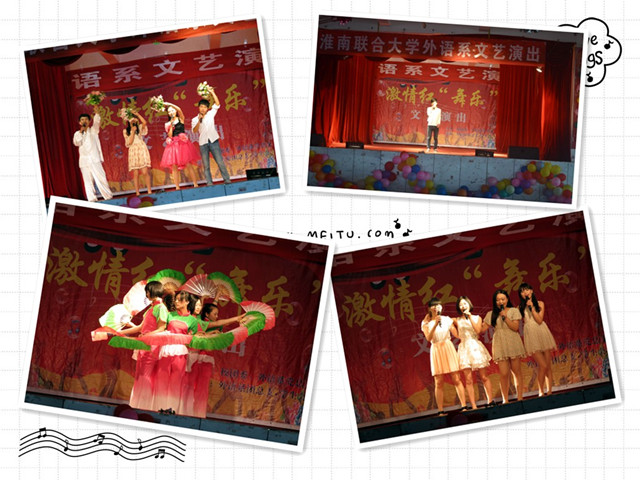 伴着优美的旋律,随着轻盈的舞步,大气澎湃的开场舞《大地飞歌》带动了全场热烈的气氛;继而富有爱国情怀的红歌串烧传递了外语学子浓浓的中国情,抒发了外语系师生对祖国的无比热爱;曼妙优雅的扇舞,少数民族风情的彝族舞以及动感劲爆的现代舞,各有千秋、尽展风采;雷人幽默的小品《新泰坦尼克号》以演员反串装扮、经典搞笑的台词将演出推向了高潮,收获了满堂喝彩;一首激情豪迈的配乐诗朗诵《最美中国梦》则诠释了师生们对祖国的美好祝愿;最后由校长、系党总支书记及学生们共同演唱的《淮南联大之歌》将演出再次推向了顶点。赵校长还即席表达了他对外语系师生的鼓励和期望,深深地感动、感染了在场的每一位观众。演出历时一个小时,圆满落幕。