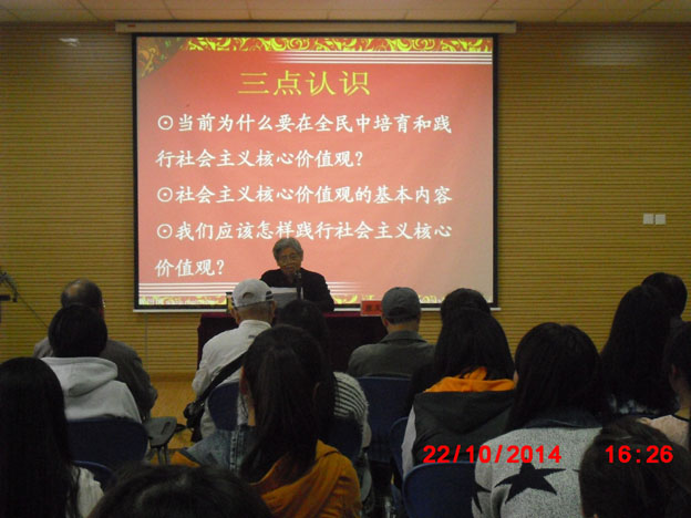 最后,系党总支书记代表外语系师生对关工委老同志们表达了感谢和祝福。他要求全体学生要认真领会报告会精神,将社会主义核心价值观融入到自身的学习、生活和工作中,坚定信仰,积极实践,为实现中华民族伟大复兴的“中国梦”而不懈努力。