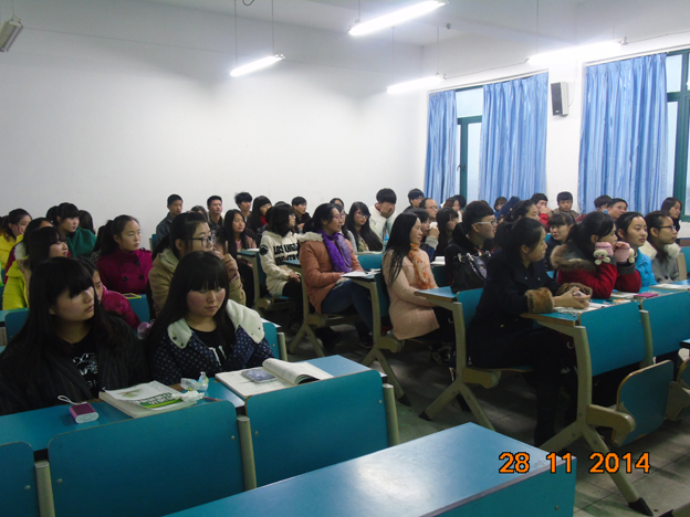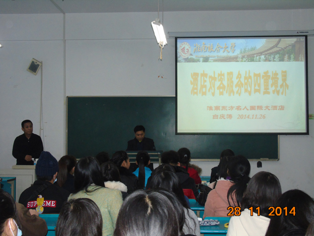 11月28日下午,校企合作单位——淮南东方名人国际大酒店白庆涛总经理应邀来我系讲学。政文系教学负责人及相关专业教师出席报告会。