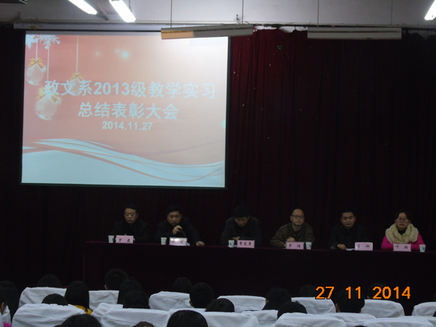 11月27日下午,政文系在报告厅召开2013级教学实习表彰暨总结大会。系部负责同志、教研室主任、班主任及2013、2014级学生参加大会,会议由副主任李琳主持。