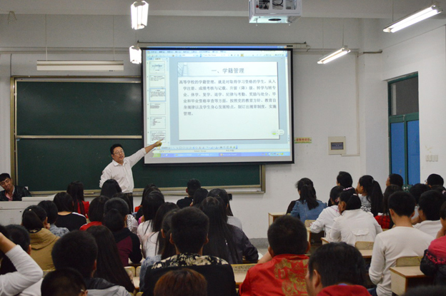 为使2014级新生尽快适应大学阶段的学习生活,熟悉我校相关学籍管理制度,加强自我约束意识。 10月10日晚,由校教务科科长、14级软件技术专业班主任许康老师,在西教学楼406教室为计算机系新生作了一场精彩的学籍管理专题讲座。