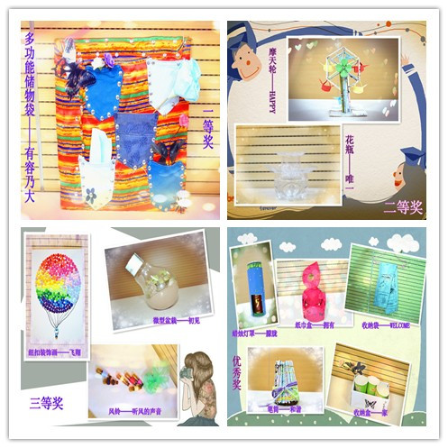 学生们利用废旧物品,经过自己的创新设计,制作出了储物袋、花瓶、风铃、笔筒等作品,设计精心、创意非凡。比赛一共遴选出了11个作品,经过评选,2014级涉外旅游班的陈雪同学DIY的悬挂储物袋荣获一等奖。我们将选送优秀作品参加学校的首届创意创新比赛,期待他们取得好成绩。