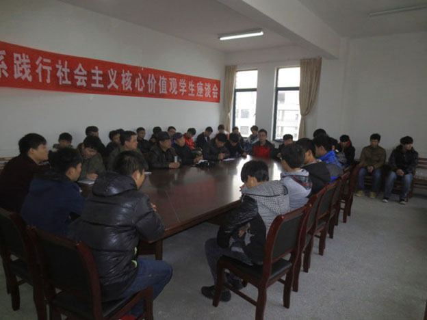 座谈会上,校关工委老师简单明了的分析践行社会主义核心价值观的原因,主要是为了应对西方价值观对中国不断渗透的需要,为了应对当代中国社会转型的需要,实现中华民族伟大复兴中国梦的需要;强调了在学生中间要不断深入开展中国特色社会主义和中国梦宣传教育,让学生树立坚定的理想信念;并结合自身的实际情况谈论了加强会主义核心价值观教育的重要性。学生代表对如何在生活和学习中践行社会主义核心价值观进行了广泛的交流,对如何提升自身的素质、学会诚信,防止传销等方面进行了热烈的讨论,对学校如何更好的发展提出了自己的建议。