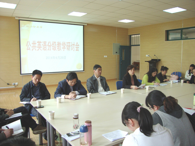 为进一步提高我校公共英语教学水平,完善公共英语教学体系,同时也为配合学校2013-2014学年第二学期期中教学检查,4月29日下午,外语系在情景实验室召开了“公共英语分级教学研讨会”。会议由外语系主任主持,教务处、各系负责同志、公共英语全体教师和分级教学班学生代表参加。