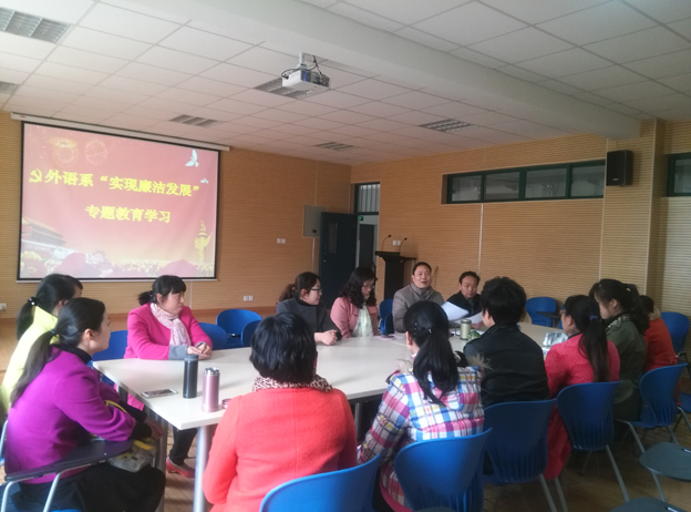 根据学校关于“实现廉洁发展”专题教育活动的统一部署与要求,外语系于4月9日,在实训楼四楼语言情景实训室1组织召开了“实现廉洁发展”专题教育会议。系党总支书记主持会议,全体教师党员参会。