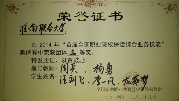 在12月28日第一届全国保险职业技能大赛中,由经济系周兵、杨勇老师指导的2013级金融保险专业学生李一凡、汪刘飞、尤茹梦三名学生在与来自全国20所高校的角逐中喜获三等奖。