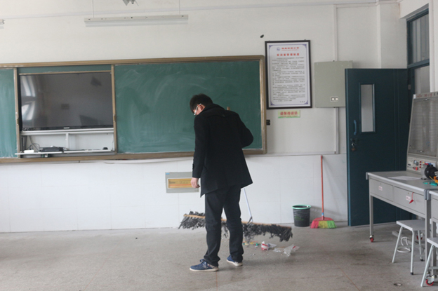 3月29日中午,为营造一个健康、清洁、美丽的学习环境,提高同学们的环保意识,机电系组织全体系干和勤工俭学学生,在实训楼开展了一次全面的卫生大扫除,清理卫生死角活动,重点是针对教室的门窗、走廊、楼梯和厕所的卫生死角。