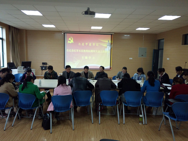 10月27日中午12点30分,外语系在实训楼情景实训室1开展了“习近平总书记在纪念红军长征胜利80周年大会上的讲话”的专题学习。会议由系党总支书记主持,全体党员同志参会。