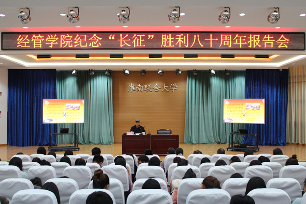 为了纪念红军长征胜利八十周年,11月15日下午,经管学院在南区一号报告厅隆重举办了纪念红军“长征”胜利八十周年专题报告会,报告会由校关工委卢凡爱同志围绕“接过先辈旗帜,走好新长征路”这一主题,运用鲜活的案例和感人的故事展开生动讲解。校关工委老师以及经管学院党员教师、入党积极分子和学生干部参加了本次专题报告会。