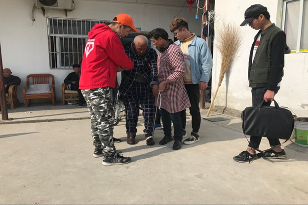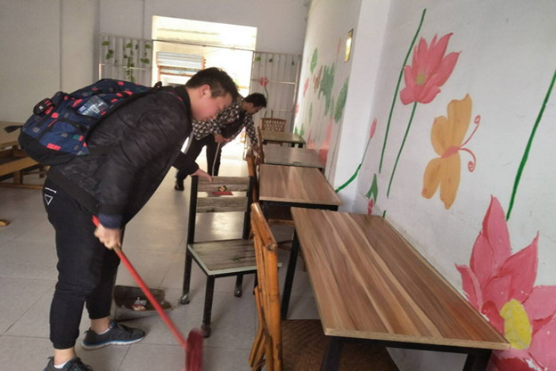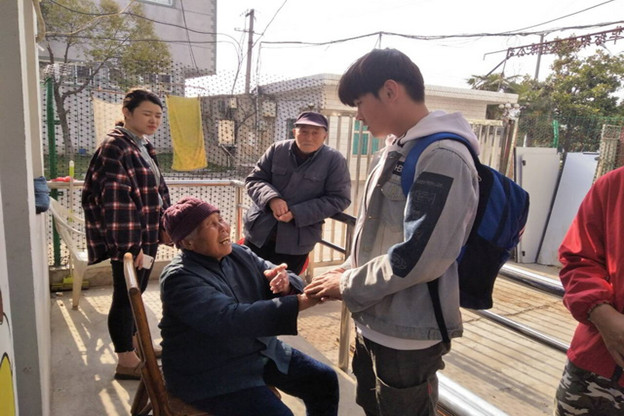 一到老年公寓,同学们主动和院中晒太阳的老人们打招呼,送上了精美的食品和营养品,在老师的指挥下,分工分组,擦门窗、扫地面、运垃圾等等,几位女同学帮扶着行动不便的老人在院子里漫步锻炼。