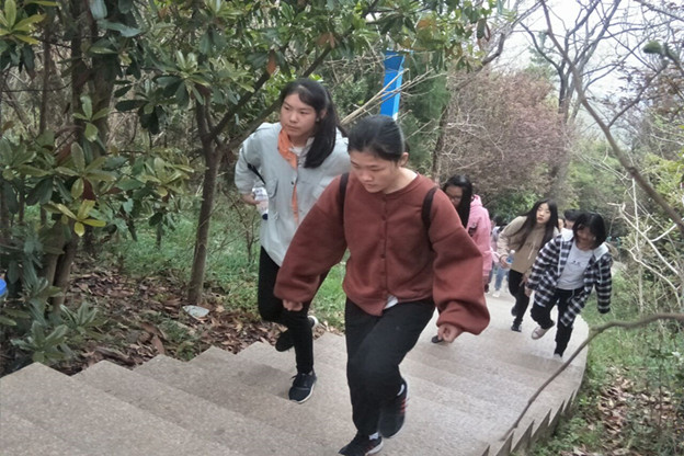 一声哨响,同学们争先恐后,纷纷向舜耕山顶开始冲刺。一路上,同学们都难掩兴奋之情,一边沿着台阶大步前进、一边欣赏四周的美景,山间姹紫嫣红,景色怡人。
